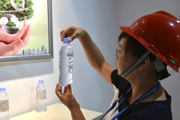 參觀者納悶,一位來(lái)自江西的代表提出了疑問(wèn)。該公司公用工程運(yùn)行部技術(shù)員王君翰解釋道:“沒(méi)有商標(biāo)的是處理水,礦泉水是用來(lái)對(duì)照觀察的。”