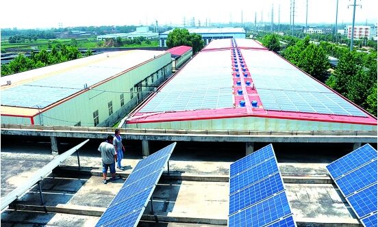 7月14日,三門峽產(chǎn)業(yè)集聚區(qū)光伏發(fā)電項(xiàng)目員工在一家企業(yè)屋頂巡檢太陽能板。該項(xiàng)目是三門峽首個(gè)光伏發(fā)電項(xiàng)目,2013年6月投產(chǎn),裝機(jī)容量逐步增加到19.5兆瓦。項(xiàng)目利用園區(qū)10余家工廠廠房屋頂覆設(shè)的太陽能板,發(fā)電除滿足企業(yè)自用外,大部分電量銷售給國(guó)家電網(wǎng)三門峽供電公司。 |