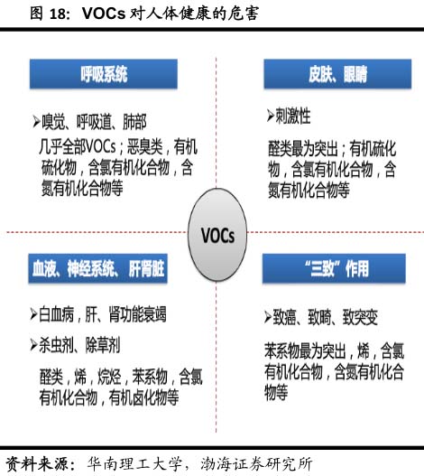 VOCs具有光化學(xué)活性,可產(chǎn)生臭氧污染,形成二次有機氣溶膠,是形成大氣復(fù)合污染、產(chǎn)生霧霾的重要前體物之一,帶來嚴重的環(huán)境污染;同時,大部分VOCs本身對人體健康也會造成一定的危害。從來源方面看,VOCs則主要產(chǎn)生于石化、有機化工、合成材料、化學(xué)藥品原料制造、包裝印刷、裝備制造涂裝、塑料產(chǎn)品制造等行業(yè)。