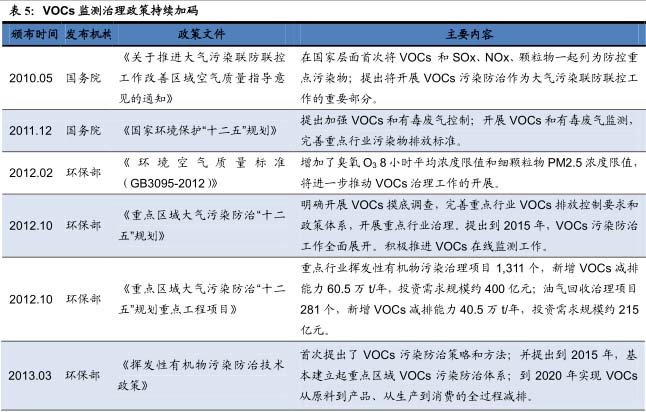 2010年5月國務(wù)院發(fā)布《關(guān)于推進大氣污染聯(lián)防聯(lián)控工作改善區(qū)域空氣質(zhì)量的指導(dǎo)意見》,首次將VOCs與二氧化硫、氮氧化物、顆粒物等一起列為大氣污染聯(lián)防聯(lián)控的重點污染物,提出加大VOCs污染防治。“十二五”期間,VOCs污染治理和防控政策則進入密集發(fā)布期,環(huán)保“十二五”規(guī)劃提出要開展VOCs和有毒廢氣監(jiān)測,完善重點行業(yè)污染物排放標(biāo)準(zhǔn)。