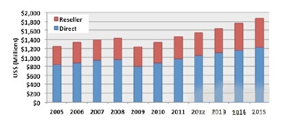 The size and growth of the NC software and related services market based on end-user payments is shown in the chart. It can also be seen that approximately one-third of the end-user payments result in reseller revenues and approximately two-thirds of the revenues are payments made directly to software suppliers.