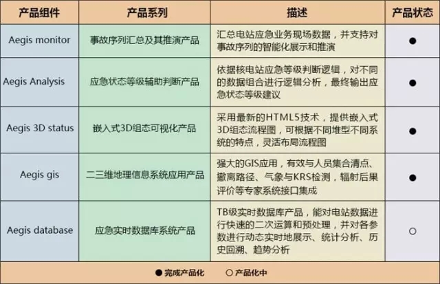 目前,“神盾”系列產(chǎn)品主要包括:事故序列匯總及其推演產(chǎn)品、應(yīng)急狀態(tài)等級(jí)輔助判定產(chǎn)品、嵌入式3D組態(tài)可視化產(chǎn)品、地理信息系統(tǒng)應(yīng)用等核心產(chǎn)品。詳細(xì)功能見下表。