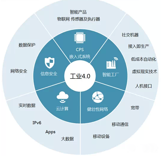 從圖中可以看出,德國(guó)“工業(yè)4.0”中的智能制造處處與新一代信息技術(shù)相關(guān)聯(lián)。“工業(yè)4.0”本質(zhì)是基于“信息物理系統(tǒng)”實(shí)現(xiàn)“智能工廠”。在生產(chǎn)設(shè)備層面,通過(guò)嵌入不同的物聯(lián)網(wǎng)傳感器進(jìn)行實(shí)時(shí)感知。通過(guò)寬帶網(wǎng)絡(luò),通過(guò)數(shù)據(jù)對(duì)整個(gè)過(guò)程進(jìn)行精確控制;在生產(chǎn)管理層面,通過(guò)互聯(lián)網(wǎng)技術(shù)、云計(jì)算、大數(shù)據(jù)、寬帶網(wǎng)絡(luò)、工業(yè)軟件、管理軟件等一系列技術(shù)構(gòu)成服務(wù)互聯(lián)網(wǎng),實(shí)現(xiàn)物理設(shè)備的信息感知、網(wǎng)絡(luò)通信、精確控制和遠(yuǎn)程協(xié)作。