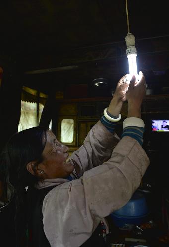 在西藏江孜縣龍馬鄉(xiāng)最康村,45歲的德慶擦拭家中的節(jié)能燈。