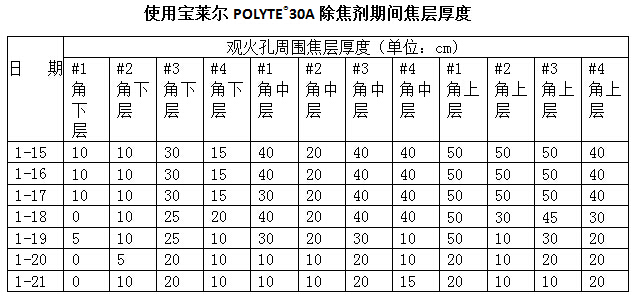 從表格看出,投用除焦劑的四天后,鍋爐觀火孔周圍的結(jié)焦情況有了改善,焦層厚度有了明顯的下降。盡管肉眼觀察存在差異,但是結(jié)焦厚度降低的趨勢(shì)依然非常明顯的。由此可見#2鍋爐燃燒器上、中、下三層的結(jié)焦情況明顯好轉(zhuǎn),POLYTE®30A除焦劑起了很大的作用。