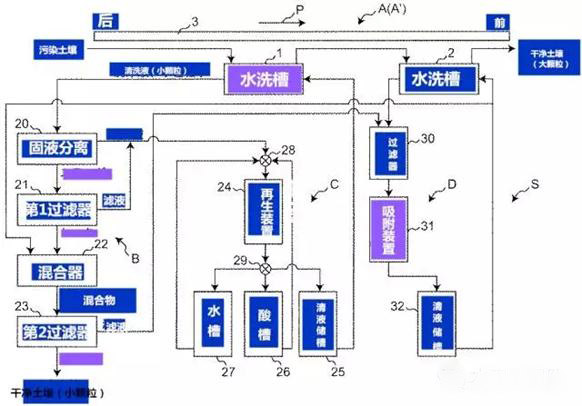 以上為土壤凈化系統(tǒng)S,組成部分為:土壤修復(fù)單元A、小直徑粒子回收B、洗凈液再生系統(tǒng)C及清潔系統(tǒng)D。