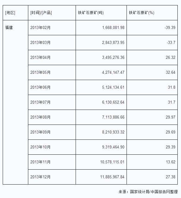 2013年福建鐵礦石原礦生產(chǎn)量及增速情況