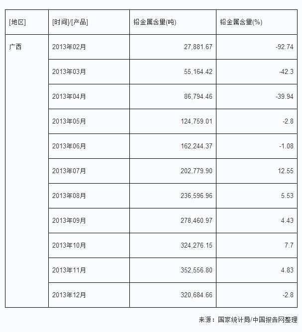 2013年廣西地區(qū)鉛金屬生產(chǎn)量及增速情況