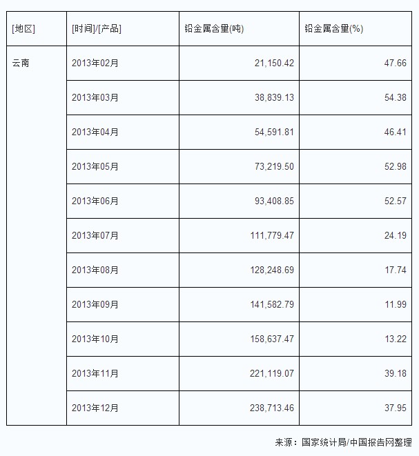 2013年云南地區(qū)鉛金屬生產(chǎn)量及增速情況