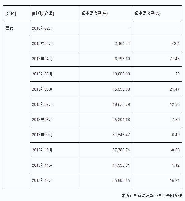 2013年西藏地區(qū)鉛金屬生產(chǎn)量及增速情況