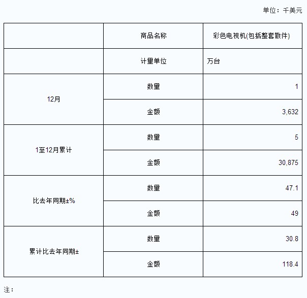 2013年1-12月中國進(jìn)口彩色電視機(jī)(包括整套散件)商品數(shù)量及增速同比