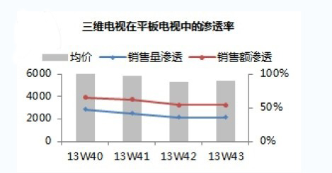 13年(10.21-10.27)三維電視銷(xiāo)量滲透率35.5%,零售額滲透率54.2%。