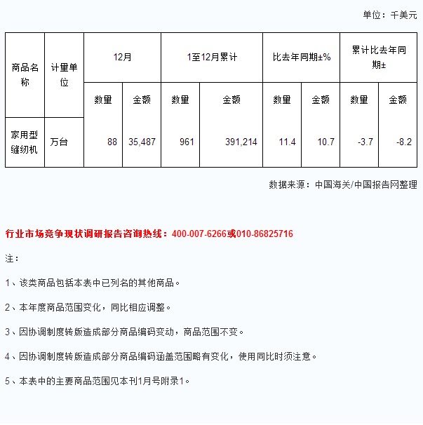 2013年1-12月中國家用型縫紉機出口量及增速統(tǒng)計