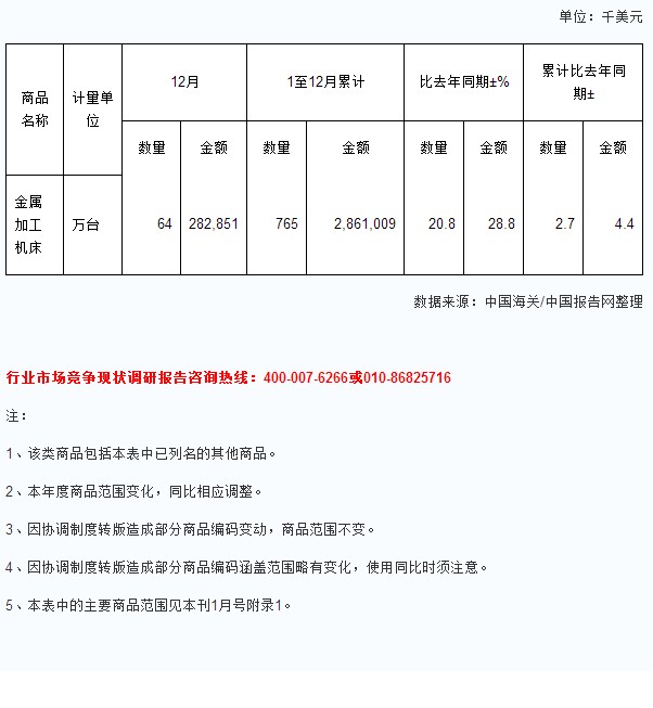 2013年1-12月中國金屬加工機床出口量及增速統(tǒng)計