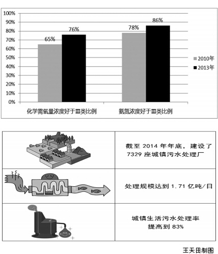 截至2014年,全國化學(xué)需氧量、氨氮排放量分別為2294.6萬噸、238.5萬噸,“十二五”化學(xué)需氧量減排進(jìn)度已經(jīng)超額完成,氨氮完成減排目標(biāo)的98%。從水質(zhì)來看,全國國控斷面化學(xué)需氧量濃度好于Ⅲ類的比例從2010年的65%,上升到2013年的76%,氨氮濃度好于Ⅲ類的比例從2010年的78%上升到2013年的86%,兩項指標(biāo)均有明顯改善。