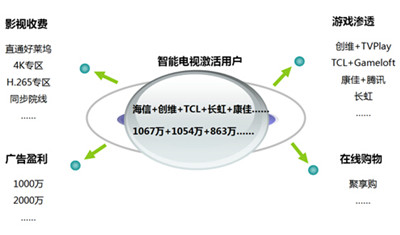 其二,智能電視內(nèi)容與服務(wù)的價(jià)值初現(xiàn)?,F(xiàn)階段,彩電企業(yè)在智能電視內(nèi)容和服務(wù)上的資源整合已初具規(guī)模,涉及視頻、游戲、購物、資訊等多個(gè)方面,而在此基礎(chǔ)上的智能電視大屏價(jià)值已初露端倪。