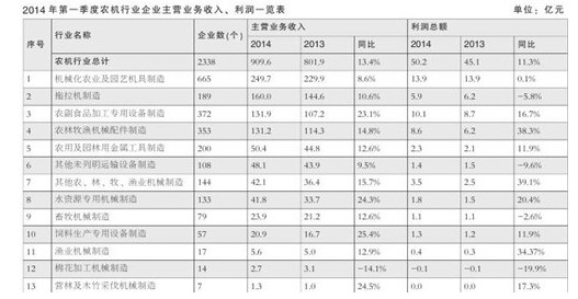 從農(nóng)機行業(yè)的13個子行業(yè)的表現(xiàn)分析,2014年一季度農(nóng)機行業(yè)各子行業(yè)保持了良好的運行態(tài)勢,統(tǒng)計顯示,在13個子行業(yè)中,主營業(yè)務收入除棉花加工機械行業(yè)同比出現(xiàn)14.1%的滑坡外,其它均出現(xiàn)不同程度的增長,其中有4個行業(yè)增幅超過20%。