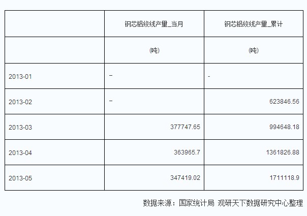2013年1-5中國(guó)鋼芯鋁絞線月產(chǎn)量1711118噸