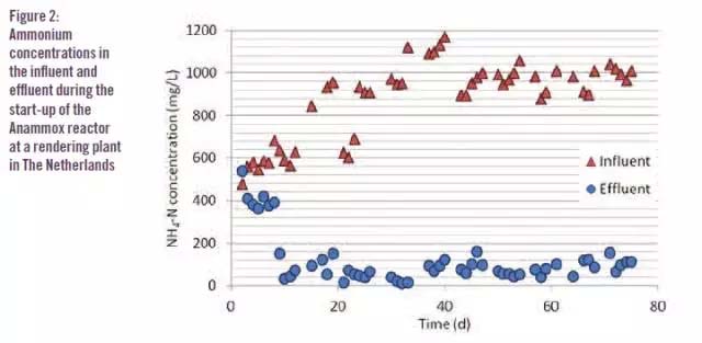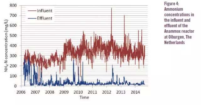即使伴隨著每天以及季節(jié)性的來水氨氮負(fù)荷變化,該廠也均能穩(wěn)定達(dá)到90%的氨氮去除率。在過去的5年中,平均的氨氮去除率達(dá)到92%,出水濃度平均約28mg/L。最近一次出水氨氮最高值出現(xiàn)在2012年6月,但這是由于誤操作導(dǎo)致反應(yīng)器中80%的污泥被沖出,而反應(yīng)器隨后在沒有外加接種污泥的情況下迅速恢復(fù)。目前,經(jīng)過修正后的設(shè)計(jì)和運(yùn)行經(jīng)驗(yàn)已經(jīng)成為Paques公司設(shè)計(jì)厭氧氨氧化工藝的標(biāo)準(zhǔn)。