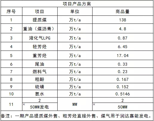 一期:100萬t/a塊煤提質(zhì)裝置及配套荒煤氣凈化裝置、污水回收利用裝置、公用工程;