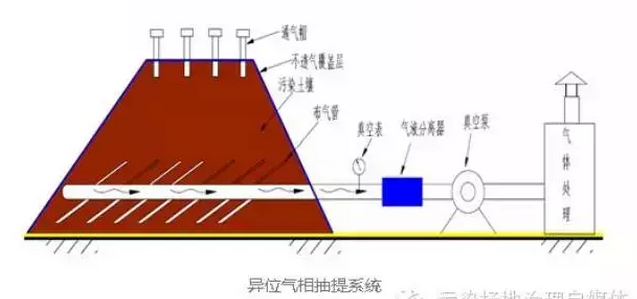 SVE系統(tǒng)要求在包氣帶中設(shè)立抽氣井(井群),使用真空泵在地表抽取包氣帶中的空氣,抽出的氣體要經(jīng)過除水汽和碳吸附后排入大氣、或根據(jù)污染物的不同,采用相應(yīng)的氣體處理技術(shù)。