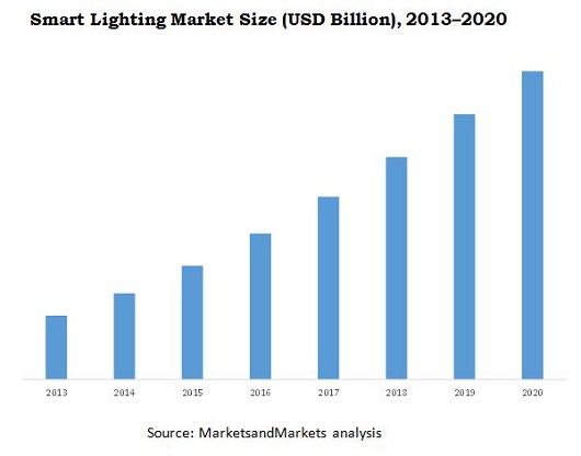 全球第二大市場研究咨詢公司MarketsandMarkets最新發(fā)布的市場研究報告指出,到2020年,總的智能照明市場預(yù)計將達(dá)到81.4億美元,2015年到2020年之間的復(fù)合年增長率為22.07%。