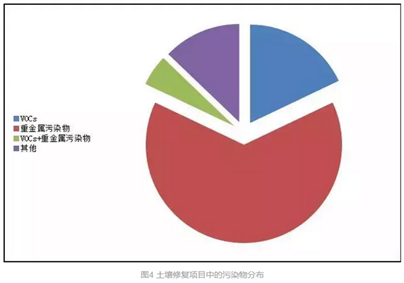 已開(kāi)展的土壤修復(fù)項(xiàng)目中的污染物仍舊以重金屬和VOCs為主。其中重金屬修復(fù)項(xiàng)目比例為64.1%,VOCs修復(fù)項(xiàng)目比例為17.9%(圖4)。