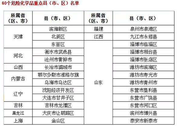 根據(jù)2014年2月國(guó)務(wù)院安委辦印發(fā)的《危險(xiǎn)化學(xué)品重點(diǎn)縣(市、區(qū))安全生產(chǎn)攻堅(jiān)工作方案》中的60個(gè)危險(xiǎn)化學(xué)品重點(diǎn)縣(市、區(qū))名單,可以概覽我國(guó)潛在危化品污染場(chǎng)地的分布情況。