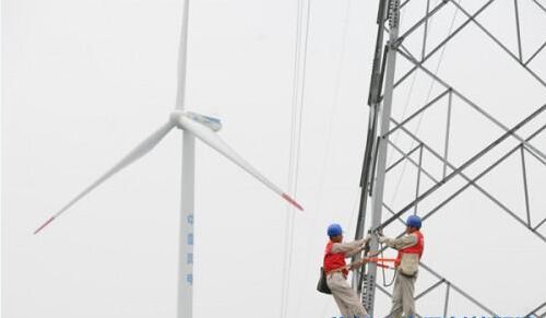 圖為:8月20日,國網(wǎng)安徽省天長市供電公司運維人員在檢修風(fēng)力發(fā)電機組輸電線路。
