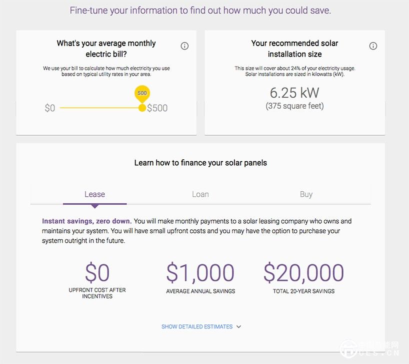 你只要在谷歌提供的工具中輸入自家地址和每月的電費等數(shù)據(jù),它便可以為你推薦合適的太陽能電池尺寸,并計算具體的購買或租用成本。