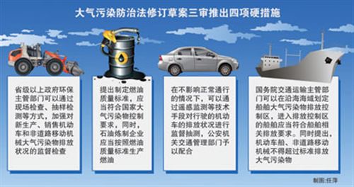提高燃油質(zhì)量標準,明確環(huán)保部門可到車廠進行現(xiàn)場檢查、抽樣檢測,增加遙感監(jiān)測手段對行駛的機動車進行監(jiān)督抽測,嚴控船舶大氣污染排放……大氣污染防治法修訂草案三審稿中的這些硬措施,有望成為治理大氣污染的四項新“法寶”。