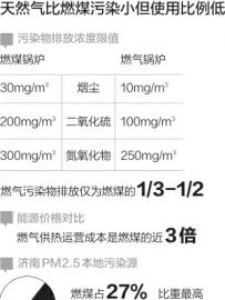 先看一組數(shù)字:在濟(jì)南PM2.5本地污染源中,燃煤占27%,比重最高;2014年,煤炭消費(fèi)占能源消費(fèi)總量的62%,其中供熱用煤占全年煤炭消耗量的13%,而且冬季采暖導(dǎo)致燃煤污染比平時(shí)更嚴(yán)重;與之相較,燃?xì)馕廴疚锱欧艥舛认拗祪H為燃煤的1/3-1/2,污染少一大半;但2014年濟(jì)南天然氣消費(fèi)僅占能源消費(fèi)總量的2.4%,在集中供暖熱源中的比重更是微不足道。