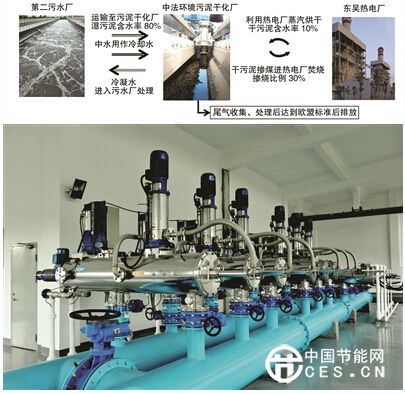 而污水處理廠產(chǎn)生的濕污泥用專(zhuān)用封閉車(chē)輛運(yùn)到中法環(huán)境工廠內(nèi)污泥干化系統(tǒng)進(jìn)料倉(cāng)。其主要工藝路線(xiàn)是利用東吳熱電廠的蒸汽將含水率80%的濕污泥干化至含水率10%-30%的干污泥;干化后的污泥與煤摻和后送入東吳熱電廠鍋爐內(nèi)焚燒,回收污泥中所含熱能;同時(shí)園區(qū)第二污水處理廠的中水和尾水將分別用作干化設(shè)備冷卻水和廠區(qū)保潔、綠化用水,實(shí)現(xiàn)資源循環(huán)利用;污泥干化中產(chǎn)生的冷凝水直接排放到鄰近的第二污水處理廠處理。