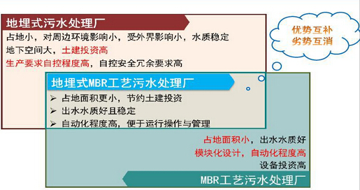 MBR技術(shù)有兩個(gè)優(yōu)點(diǎn)——出水水質(zhì)好,節(jié)省占地。地下污水處理廠和MBR技術(shù)的結(jié)合是優(yōu)勢(shì)互補(bǔ)、劣勢(shì)互銷的模式。地下污水處理廠埋深大,土建投資高,恰好MBR節(jié)省土建,從而降低了成本。
