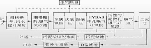 該項(xiàng)目采用A2O活性污泥-生物膜法共池工藝(HYBAS)(HYBAS:是生物膜與活性污泥的復(fù)合工藝,它具有活性污泥工藝和流動(dòng)床TM生物膜(MBBRTM)工藝的優(yōu)點(diǎn),將兩者有機(jī)的結(jié)合在同一池中)。具體工藝流程見(jiàn)下圖。