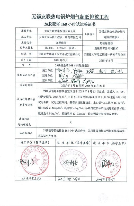 2015年8月15日8:00至2015年8月22日8:00,無錫友聯(lián)熱電有限公司與云南亞太環(huán)保共同組織進(jìn)行對無錫友聯(lián)熱電有限公司鍋爐煙氣超低排放改造項目中各項工藝指標(biāo)及設(shè)備性能進(jìn)行168小時綜合測試考核。