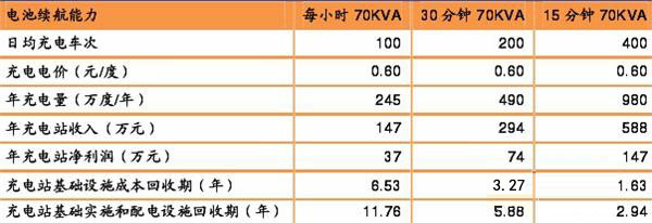 總體來看,單個充電站基礎(chǔ)設(shè)施和配電設(shè)施投資額不算大,如果電池續(xù)航能力能夠達(dá)到半小時70KVA以上,充電站成本回收期能控制在6年以內(nèi)。單個充電站基礎(chǔ)設(shè)施和配電設(shè)施投資在430萬元左右,第一階段建設(shè)75座充電站,總投資約3億元,對國家電網(wǎng)來說負(fù)擔(dān)不大。從充電站成本回收期來看,當(dāng)電池續(xù)航能力達(dá)到半小時70KVA時,充電站基礎(chǔ)設(shè)施成本回收期為3.27年,充電站基礎(chǔ)實施和配電設(shè)施回收期為5.88年,隨著電池續(xù)航能力加強,充電站成本回收期還會縮短。