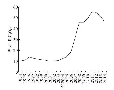 圖2 美國(guó)民用反應(yīng)堆業(yè)主與運(yùn)營(yíng)商的平均鈾價(jià)走勢(shì)( 1994—2014 年)
