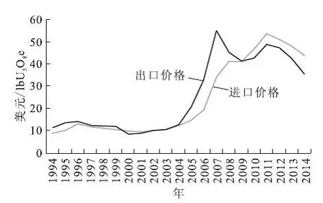 圖7 美國(guó)鈾進(jìn)出口價(jià)格( 1994—2014年)