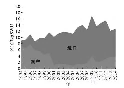 圖6 美國(guó)民用反應(yīng)堆業(yè)主與運(yùn)營(yíng)商采購(gòu)的鈾濃縮服務(wù)( 1994—2014年)