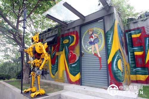 作為全球首家低碳環(huán)保特色婚慶攝影基地,倚靠園區(qū)內各處垃圾處理設備因地制宜搭建景觀。8000平方米的屋頂花園就建于停放垃圾車的停?;貥琼?,下面停放垃圾車,樓頂是大片綠化、景觀小品。