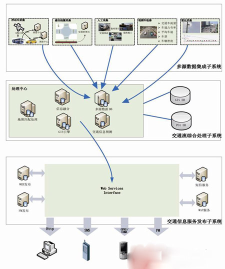 (3)信息融合共享功能:兼容、整合不同來(lái)源交通信息,所采集的交通信息經(jīng)處理后,具有與其他相關(guān)機(jī)構(gòu)、部門(mén)的信息系統(tǒng)進(jìn)行共享、交換的能力;