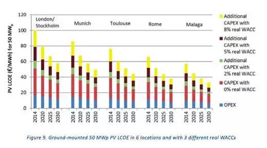 這意味著到2030年,太陽(yáng)能光伏發(fā)電的成本(包括上網(wǎng)的成本2歐分/度)將低于歐洲大部分地區(qū)的市場(chǎng)批發(fā)電價(jià)。而在南歐各國(guó)價(jià)格會(huì)更低,預(yù)計(jì)到2030年太陽(yáng)能光伏發(fā)電價(jià)格會(huì)降到20歐-25歐/MWh。在倫敦,預(yù)計(jì)2030年大規(guī)模太陽(yáng)能發(fā)電的價(jià)格將在50歐/MWh左右,相當(dāng)于現(xiàn)在市場(chǎng)批發(fā)電價(jià),但是低于核電發(fā)電價(jià)格。