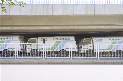 9月13日,北京市朝陽區(qū)部分純電動(dòng)環(huán)衛(wèi)車停放在橋下。