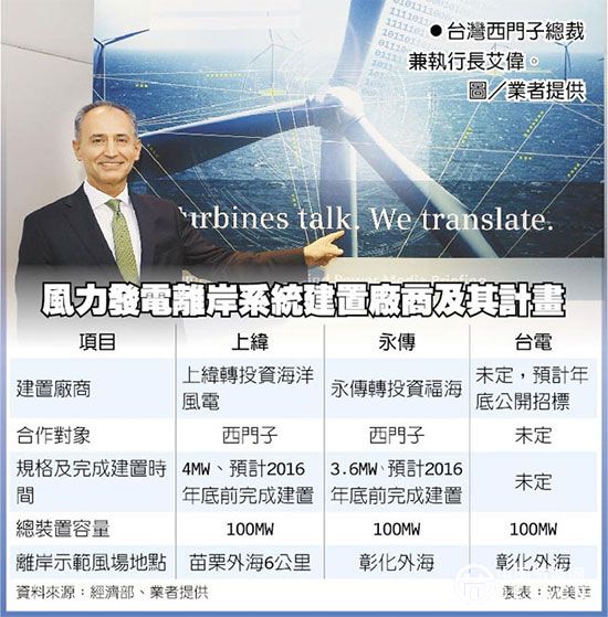 艾偉昨日表示,西門子過去曾幫臺電在桃園大潭建置首座結合天然氣與火力的復循環(huán)電廠,如今將協(xié)助上緯投資海洋風電,在苗栗外海6公里建置2座總裝置容量各4MW,採用西門子4G傳動軸式風機。