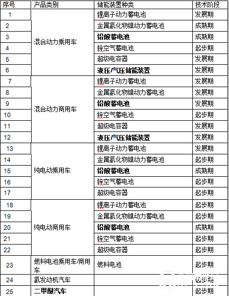 特別值得注意的是,對比2009年發(fā)布的《新能源汽車技術階段劃分表》,“鉛酸蓄電池和液壓/氣壓儲能裝置”和“二甲醚汽車”未出現在新《新能源汽車技術階段劃分表》里。