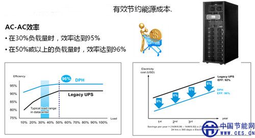 ■ 采用轉(zhuǎn)換效率高的UPS系統(tǒng)。目前,新一代數(shù)據(jù)中心的設(shè)計(jì)基本采用新型的高頻(IGBT技術(shù))UPS系統(tǒng),電源轉(zhuǎn)換效率和功率因數(shù)都比傳統(tǒng)的工頻(可控硅技術(shù))UPS系統(tǒng)有非常大的提升,而且重量輕和體積小。由于UPS的電源轉(zhuǎn)換效率和負(fù)載率成正向關(guān)系,因此在設(shè)計(jì)和運(yùn)維時(shí)要盡可能提高UPS的負(fù)載率。
