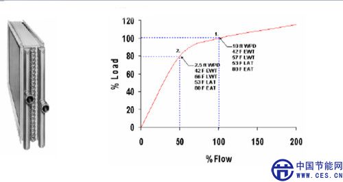 實(shí)現(xiàn)節(jié)能的原理:低流量大溫差與熱交換能力的關(guān)系,對(duì)于一個(gè)換熱器(板換或者精密空調(diào)表冷器)來說,其流量與溫差的關(guān)系見下圖,在部分負(fù)荷下,其冷量與流量不會(huì)同比下降,如圖,在50%的流量下,可以提供大約80%的負(fù)荷,也就是說系統(tǒng)的冷量與流量不會(huì)完全對(duì)應(yīng),但是每個(gè)廠家的換熱器性能不一定,故最佳換熱流量并不統(tǒng)一,這個(gè)最佳流量基本會(huì)在30%-70%之間,使得溫差最大會(huì)高于5℃。