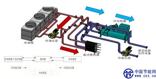 自然冷卻技術(shù)就是利用免費(fèi)的自然資源進(jìn)行熱交換,最大限度的降低機(jī)房能耗,目前常用的免費(fèi)冷源主要是冬季或春秋季的室外空氣。因此,如果可能的話,數(shù)據(jù)中心的選址應(yīng)該在天氣比較寒冷或低溫時間比較長的地區(qū)。在中國,北方地區(qū)都是非常適合采用免費(fèi)制冷技術(shù)。采用水冷空調(diào)系統(tǒng),當(dāng)室外環(huán)境溫度較低時,在低于15度以下(上海地區(qū)每年約有120天)就關(guān)閉制冷機(jī)組,可以利用冷卻塔、冷卻水泵、板式換熱器組成的系統(tǒng)進(jìn)行熱交換,因系統(tǒng)中沒有大功率的壓縮機(jī)運(yùn)轉(zhuǎn),極大的降低了系統(tǒng)的效率,當(dāng)溫度高于15度又切換回冷凍水系統(tǒng)。上述介紹的水冷自然冷卻由于只需要增加一臺不需要動力的板式換熱器,投資和占地都比較少,是我們推薦的企業(yè)數(shù)據(jù)中心最佳免費(fèi)制冷節(jié)能方案,系統(tǒng)的原理圖如下。