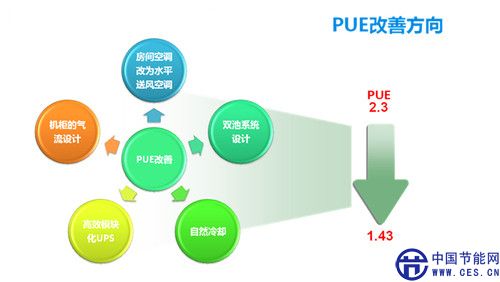 根據(jù)以上耗電系統(tǒng)分析,PUE主要的改善方向如下: